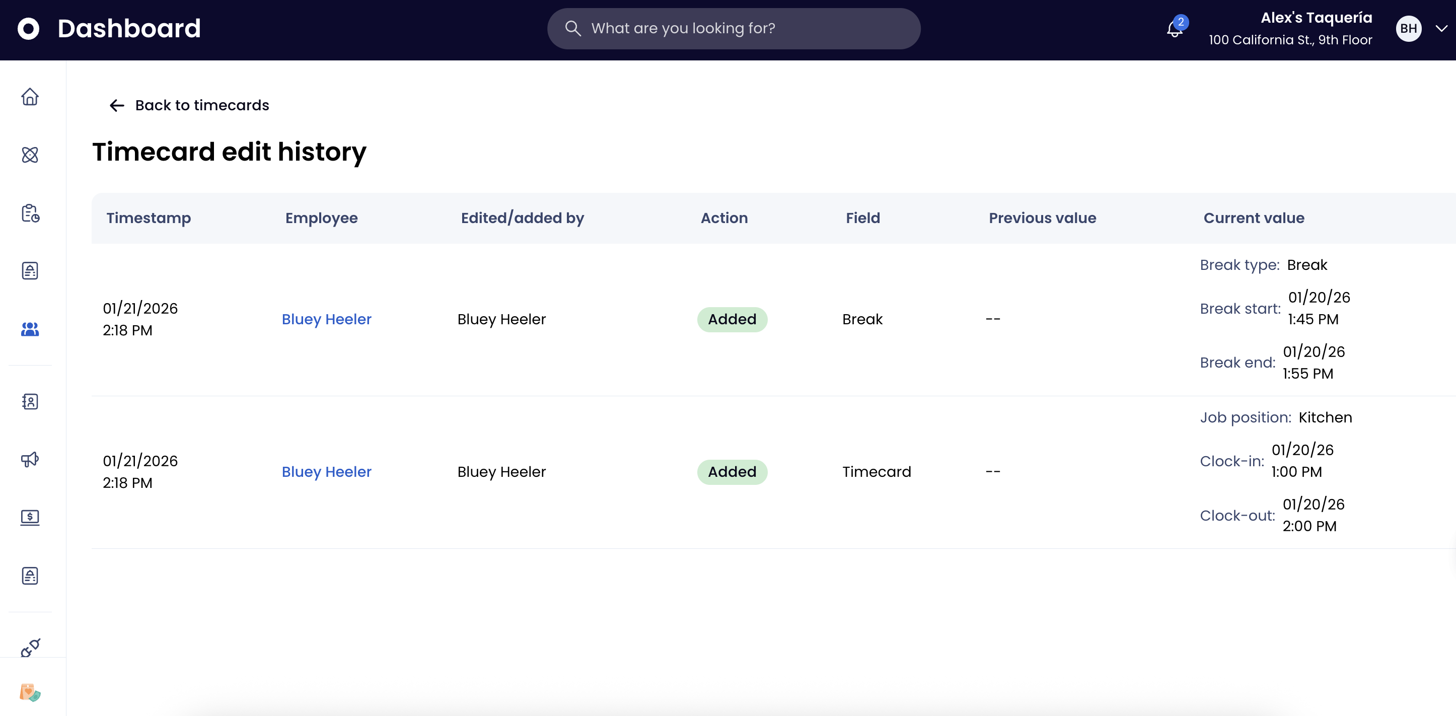 Timecard edit history gives you a clear record of every change—who made it, what was updated, and when it happened. You can also export edit history anytime to help with payroll reviews or compliance needs.